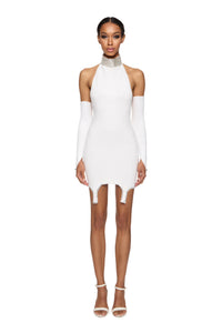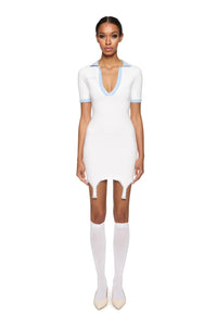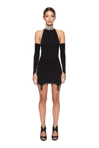 Knitted top with vegan leather chocker and mini skirt with vegan leather belt